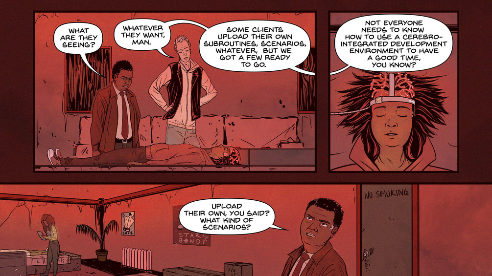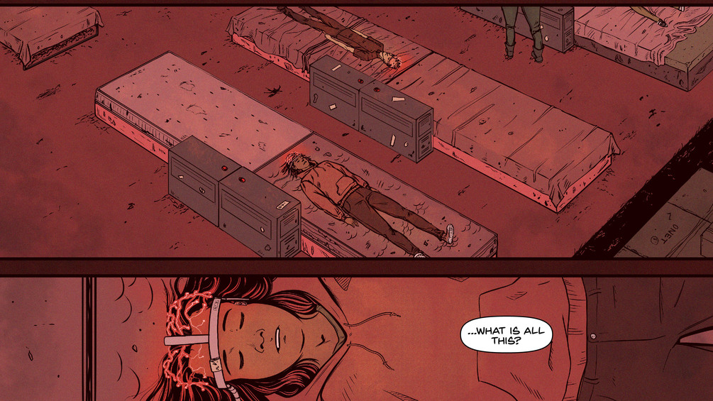 Frank enters the room to find an ocean of beds, with seemingly comatose bodies, an unknown device attached to the occupants’ heads...